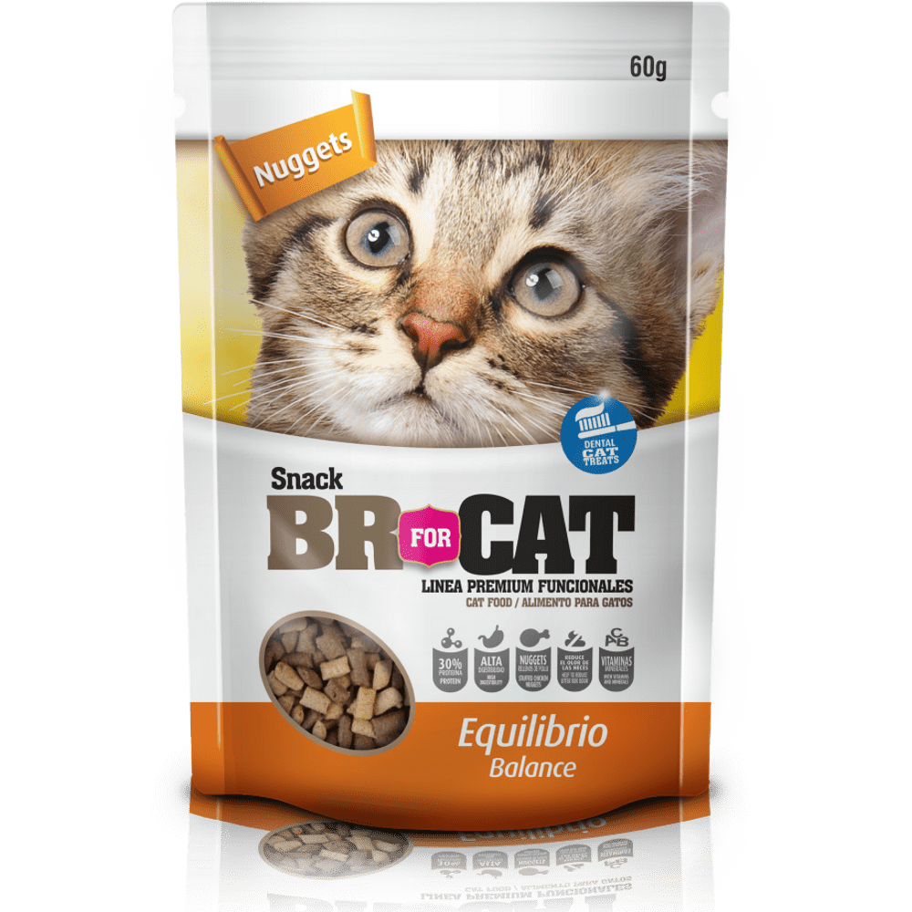 Br For Cat Nuggets Balance es un suplemento alimenticio para gatos de todas las razas y tamaños el cual puede ser suministrado a diario durante actividades recreativas como forma de premio al aprendizaje.