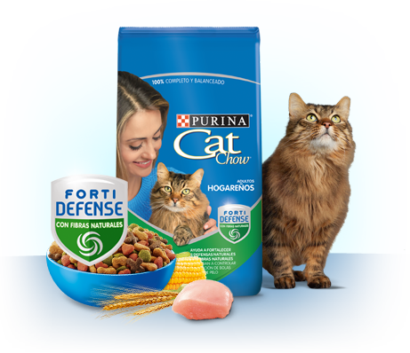El nuevo PURINA® CAT CHOW® HOGAREÑOS CON DEFENSE PLUS ofrece los nutrientes que tu gato necesita para mantenerse saludable y libre de molestias. Contiene fibras de soja y celulosa, que ayudan a controlar la formación de bolas de pelo.