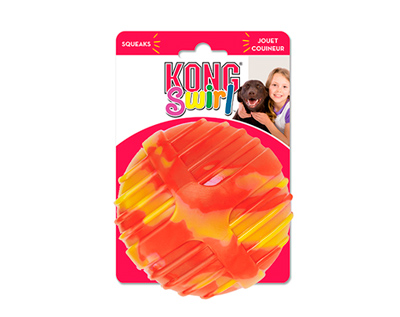 KONG Swirl hace el juego vibrante y divertido. Los colores brillantes y un chirrido fuerte atraer a los perros, mientras que el rebote errático crea emocionantes juegos interactivos . KONG remolino continuará a chirriar incluso si el juguete está perforada por lo que el juego no tiene que parar.